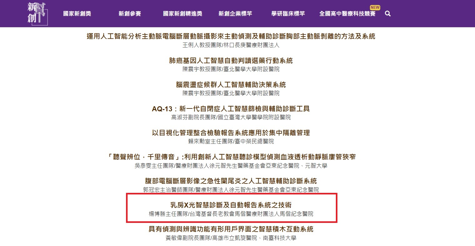恭賀!!馬偕醫院與中央大學攜手合作研發「乳房X光智慧診斷及自動報告系統之技術」,榮獲國家創新獎智慧醫療與健康科技類學研創新獎。